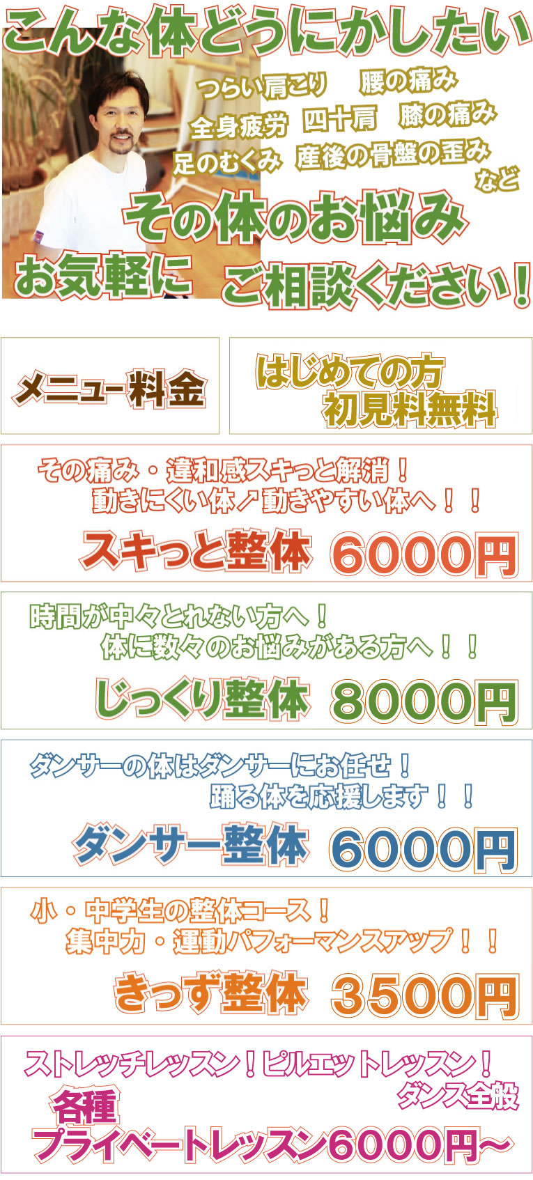 | 緊張した筋肉や、緩んでしまった筋肉を、気持ちの良い刺激で調整し、バランスを整えていくことで、動きやすく、動きたくなる体にしていきます。 整体後は風船が付いているかのようです。 seitai<<<< | 体が①今よりも辛くならないよう維持する。②いつもいい状態でいられるように維持する。③機能が向上しさらに軽く快適になるようにする。これどれもセルフケアです。あなたの考え方でしだいです。 selfcare<<<< | 同じ症状に何度も悩まされてしまう方は、日常の習慣や動作などにも大きな問題が潜んでいます。機能的な動作を身に付け、動くほどに快適な疲れにくい、痛みにくい体を手に入れてください。 howto<<<< |